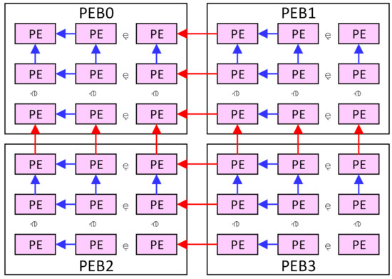 As shown in Figure 5, the PEBs are also connected with each other, and the data transmission can be performed both intra and inter the PEBs. The rightmost column of the PEB0 and PEB2 can access data from the leftmost column of the PEB1 and PEB3, respectively, and the bottom row of the PEB0 and PEB1 can access data from the top row of the PEB2 and PEB3, respectively. This makes four PEBs work as a 2m × 2m array or two 2m × m arrays, as discussed in Section 4. In this case, the four banks in the weight buffer will work as one or two banks, respectively, and weights can be shared between the PEBs.