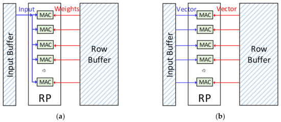 The vision chips have shown excellent performance on the vision tasks by connecting the image sensor directly with the parallel vision processing unit (VPU) [1,2,3]. They can solve the bottlenecks of the massive image data transmission and processing in the vision tasks. They generate high-quality images and extract the required information from the images [1,4,5]. The VPU is the dominant part of the vision chip and usually utilizes the single-instruction-multiple-data (SIMD) array of processing elements (PEs). VPUs in early works [2,5] were mainly composed of the arithmetic and logic unit (ALU) array. They can accomplish the image signal processing (ISP) tasks and some computer vision algorithms like speed-up robust features (SURF) [6] at high speed. Since the neural networks have been widely used for computer vision applications, some works [1,4] have tried to reconfigure the ALU array to process the neural networks like the self-organizing map (SOM) neural networks. In recent years, deep neural networks (DNN) have proved to be very efficient and have become the most commonly-used tools for computer vision tasks [7]. For example, convolutional neural networks (CNNs) are widely used for image recognition. The hybrid neural networks [8,9] that combe CNNs and recurrent neural networks (RNNs) can also be used for some specific applications such as image caption and video description [10,11]. Generally, the modern vision tasks are usually composed of two parts: the ISP and the DNNs, including the CNNs and hybrid DNNs, as shown in Figure 1. The modern VPU should be able to process the DNNs as well as the ISP algorithms [12,13,14].