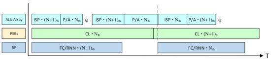 Furthermore, the CNNs and RNNs also have very different computing flows. The CNNs mainly consist of the convolutional and full-connection (FC) layers, while the RNNs are composed of several matrix-vector multiplications and element-wise multiplication operations [8,23]. Most DNPUs are proposed for the CNNs or RNNs, respectively [7,24,25]. Some DNPUs can process both the CNN and RNN with two respective units included for each one [24,26,27]; they are efficient for the hybrid DNNs. However, a lot of vision tasks only contain the CNNs, and the RNNs are not used in them, such as image recognition and object detection. When processing those tasks, the CNN accelerator will run alone, and the RNN accelerators will be idle, resulting in the hardware’s waste. To date, only a few works [8,25] have tried to implement both the CNNs and RNNs on one unit for the hybrid DNNs. However, they have not considered the fact that the convolutional layers consume much more computation than the FC layers/RNNs. They allocate the same hardware to both the convolutional and FC layers/RNNs. Therefore, they need to process the DNNs with a large batch of many images, such as 16 images. The convolutional layers of the batch will first be processed, image after image, which will consume a large amount of time. After that, the FC layers and RNNs for the whole batch will be processed simultaneously. When processing a large batch, they can achieve a small average latency for each image. However, when processing fewer images, the latency of each image will increase greatly, and a lot of hardware will be idle during the processing of the FC layers and the RNNs. This is not practical for real-time vision tasks [28]. Therefore, none of the state-of-the-art DNPUs are suitable to process the DNNs in modern vision tasks. The CNNs and the hybrid DNNs should be processed with one unit while the hardware allocation is customized with the different requirements of the subtasks. Much more computing resources should be allocated to the convolutional layers than the others [7,8,24].