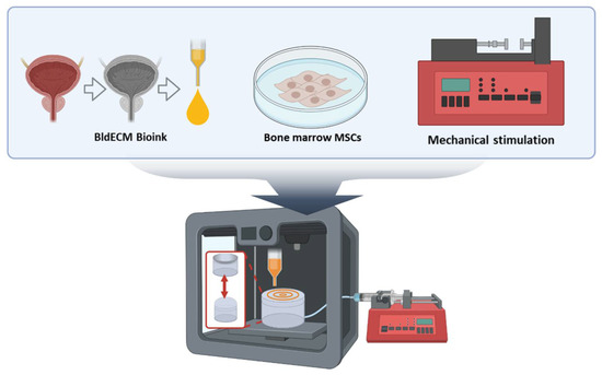 In this study, we propose an advanced in vitro bladder model using bladder-specific dECM bioink and 3D bioprinting technology to emulate the smooth muscle functions of the urinary bladder. We hypothesize that incorporating native bladder-like ECM with physiological mechanical stimuli can improve the biofunctionality of the 3D bladder tissue model (Figure 1). To evaluate this, we developed an in vitro bladder smooth muscle tissue model using 3D bioprinting with bladder-specific dECM bioink. Additionally, we used the developed in vitro model to investigate the influence of mechanical stimuli on myogenic differentiation by establishing a biomimetic bladder model to corroborate the synergistic effects of the surrounding matrices and physiological stimulation on the maturation of the bladder smooth muscle cells. We believe that the manufacturing design and process can be used to develop biomimetic experimental platforms for bladder tissue engineering applications.