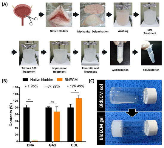 Preparation of the decellularized extracellular matrix from the bladder tissue. (A) Decellularization process through a series of physical, chemical, and enzymatic treatments. (B) Biochemical assays to evaluate decellularization, such as residual DNA, GAGs, and collagen contents in the BldECM and native bladder tissues (* p < 0.05 and ** p < 0.01; ns: Not significant). (C) Sol to gel transition of pH-adjusted BldECM hydrogel after incubation at 37 °C for 30 min.