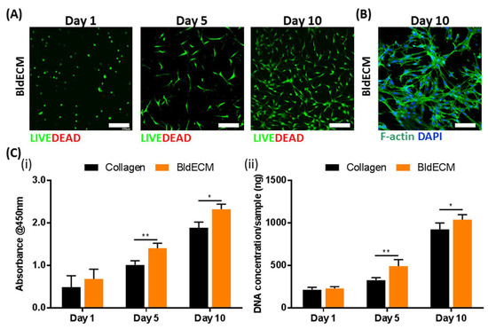 For in vitro cell and tissue culture, cellular activities, such as viability, adhesion, and growth, are essential for investigating the biological properties of the biomaterials [35]. For the cell viability test, the live/dead images of hBMSCs in BldECM were taken on days 1, 5, and 10 (Figure 4A). Results showed that most cells were viable during the entire culture period and the values for cell viability were over 90% at every time point, thereby indicating that the BldECM material is biocompatible and has no cytotoxic effect on the encapsulated cells. By F-actin staining of the hBMSCs-laden BldECM bioink on day 10, we observed an elongated phenotype with interconnected networks within the BldECM matrix, which indicated excellent cell adhesion function of BldECM (Figure 4B). Considering the cell metabolic activity, CCK-8 assay and DNA quantification analysis were performed to evaluate the ability of the BldECM bioink to promote cell proliferation compared to the collagen bioink. CCK-8 test results showed that the absorbance values of all groups increased with time. Furthermore, the proliferation of the cells in the BldECM group was significantly higher than that in the collagen group on days 5 and 10 (Figure 4C(i)). A similar trend was observed in the DNA quantification analysis (Figure 4C(ii)). These results indicate that the BldECM bioink significantly contributed to the promotion of cell proliferation compared to the single component-based bioink (i.e., collagen). In conclusion, the BldECM bioink can provide a favorable physiological microenvironment for cell growth.