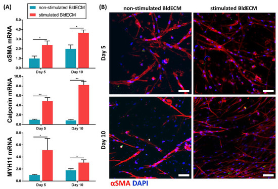 Effect of physiological stimuli on myogenesis in the engineered bladder model. (A) Changes in mRNA expression levels of myogenic markers (α-SMA, calponin, and MYH11) in the non-stimulated and stimulated BldECM groups at days 5 and 10 (* p < 0.05 and ** p < 0.01), and (B) Immunofluorescence staining of alpha-smooth muscle actin (αSMA) in the non-stimulated and stimulated BldECM groups on days 5 and 10 (scale bar = 100 μm); αSMA (red), DAPI (blue).