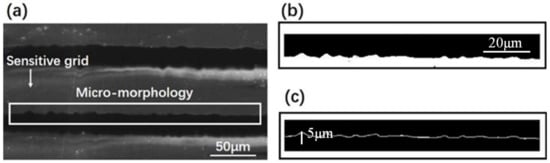 For specific manufacturing equipment and processes, the micro-morphology on sensitive grids of strain gauges obtained by wet etching is controllable within a certain tolerance. However, it is this varying degree of tolerance that can result in strain gauges of very different qualities from one manufacturer to another. In detail, this difference mainly lies in the roughness of the sidewall profile on sensitive grids. To have a visual and analytical understanding, the sidewall micro-morphology of a typical strain gauge have been observed by confocal microscopy (KH-7700 by HIROX company in Shanghai, China). Additionally, the geometric characteristics of the sensitive grids were obtained through a scanning electron microscopy (SEM). As shown in Figure 1a, the shallow gray area in the SEM image refers to sensitive grids, while the dark gray is the blank gap between them. With image processing methods, Figure 1b,c show the sidewall profile of a sensitive grid from the viewpoint of a binary image.