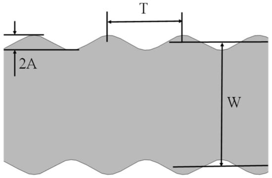 Among the above four kinds of resistive strain gauges, the basic dimensional sizes corresponding to the type HBM1-DY13-3/350 were selected to build the simulation model, in which the grid width is 50 μm and the thickness is 5 μm [17]. Following the parameters in Table 1, a geometrical model of the sidewall profile was constructed to study the GF. As shown in Figure 2, the complex waveforms or zigzag sidewalls demonstrated in Table 1 are simplified to be a standard cosine curve, where the amplitude (A) and period (T) describe the cosine type profile. In real work situations, the strain in elastic elements produced by an applied tension force is passively transferred to the sensitive grids through the substrate and adhesive layer [14], to apply a uniform shear force into the sensitive grid and reduce the reinforcement effect, the sizes of both substrate and adhesive layer are set to be larger than that of the sensitive grid.