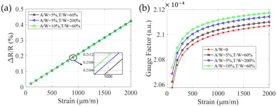 The parameters of both amplitude (A) and period (T) in the cosine profile model (Figure 2) are normalized by the widths of the sensitive grids (W). Numerically, they are expressed as A/W (relative amplitude, RA) and T/W (relative period, RP), respectively. On this basis, RRC and GF were calculated in varying sidewall profiles and external stress conditions. In Figure 3a, RRC related with RA and RP were presented. In the interested strain range of 0 to 2000 μm/m, RRCs are almost linearly proportional to the applied strain. For a certain strain (1000 μm/m), the growing tendency of RRC resulting from the increase of RA and RP can be easily told in the partial enlarged view (Figure 3a). This phenomenon is well confirmed by the calculation results in Figure 3b. Particularly, it is worth noting that the scale of the abscissa interval in Figure 3b is much larger than the variation range of the ordinate; therefore, the actual curves are very close to horizontal straight lines, which means GFs approximately maintain constant. As for the small-scale increase in GFs caused by RA and RP, we can understand it as: the stress redistribution affected by the sidewall profile will aggravate the creep effect of the material [16], which eventually affect GF. From above, the varying sidewall micro-morphology of sensitive grids leads to changes in both RRC and GF. Consequently, the deviations between the rough sidewall profile and perfectly smooth one should be taken into account so as to improve the measurement accuracy of the sensitive grids [7,20].