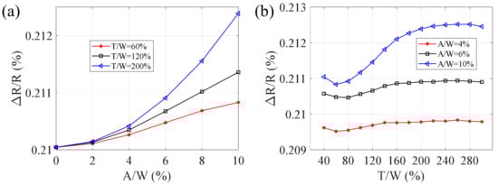 As shown in Figure 4, increasing RA (A/W) or RP (T/W) results in growing RRC. In the case of a constant RP, Figure 4a shows a sharp rising of RRC over the increasing RA, and this variation in RRC is nonlinear over a tenth of the sensitive gate width, meaning that the amplitudes of sidewall profiles gradually amplify the deviation of relative resistance change in the strain gauge under a constant load. However, as shown in Figure 4b, the results are much different. For a given RA, the RRCs fluctuate in a small range around a certain value. Take A/W = 4% for example, the waveform length would almost not lead to relative resistance change, and this is in line with the theory [21]. Still, the volatility of the RRC at the beginning step of the curve is more pronounced, while it flattens out more in the rest section. It is not difficult to understand, with a fixed RA, an increasing RP represents a smoother sidewall profile of the sensitive grid that possess a steady RRC.