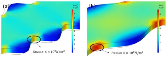 These phenomena seem reasonable when considering the correlation between sidewall roughness and stress deformations. As stated above, when RP becomes long enough, the sidewall profile equally becomes smooth. The smooth profile would reduce the local strain concentration until a homogeneous strain distribution forms. Under this condition, the deformation in resistive strain gauges would represent the strain in elastic elements to the greatest extent, and the measured GF is a standard one. Yet, there is no way to produce strain gauges with absolutely smooth sidewalls on sensitive grids. As the non-ideal sensitive grid is subjected to external stress, the deformation of each aera is uneven and the concave parts produce local stress concentrations. As shown in Figure 5, when RAs are the same in Figure 5a,b, the longer RP (Figure 5b) reduces the maximum local strain concentration within the sharp dimensional area, which results in a relatively even strain distribution within the sensitive body. Further, the even distribution induces a much larger change of relative resistance, or a more accurate sensitivity. In Figure 5a, a sharper shape on the sidewall profile produces a worse local strain concentration than that in Figure 5b, and the lower strain distribution over the grid body decreases the resistance change and leads to measurement deviation. For the same reason, for an RA that is less than 4% of the grid width (Figure 4b), the RRC becomes a basically unchanged number even the RP range from 40% to 80% in our simulations, meaning that as long as the sidewall is relatively smooth, the RRC basically maintains at the standard constant no matter how high or low RA/RP is.