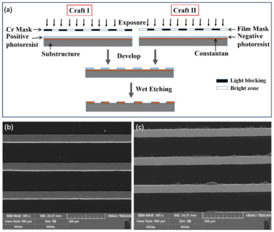 The micro-morphology of sensitive grids depends on the fabrication processes. Especially, during lithography, both mask and photoresist determine the quantity of fabricated pattern and the sidewall profile of sensitive grids. Figure 6 shows two process flows fabricating strain gauges, in which the discrepant sidewall profiles can be obtained. A Cr-mask and positive photoresist are used in the craft I, and a film mask and negative photoresist are adopted in the craft II. The former produces a smoother profile with finer resolution while the later brings out a rough one with micro-bulges on [22,23].