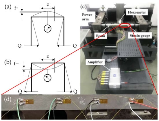 All the six samples were measured in a testing apparatus for strain gauge parameters [17,24]. As shown in Figure 8c,d, in order to be identical to actual use, the strain gauges were glued to the surface of the rigid standard elastic beam and then solidified by thermal curing process. A standard applied force produces a uniform strain in the middle of the standard flexible beam. As shown in Figure 8a,b, the pressure on the power arms bends the elastic beam delivering both negative and positive strain to the standard elastic beam. There are equal strain zones in the center area of the standard elastic beam. The strain values are calculated by the deflection theory, in which the deflection displacement of f+ and f− are measured by a standard flexometer. In addition, a Wheatstone bridge for converting the strain into an electrical signal was connected to a data acquisition amplifier (HBM QuantumX MX1615B) [17].