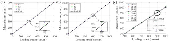 The strain response from two groups of samples to the standard strains. The geometrical parameters of (a) Group I and (b) Group II are listed in Table 3. (c) The parts of (a,b) in the range 500–1000 μm/m are plotted onto the same graph. The strain in the ordinate was measured by the samples, while the strain in the abscissa was calculated by the loading force and the displacements coming from the flexometer.