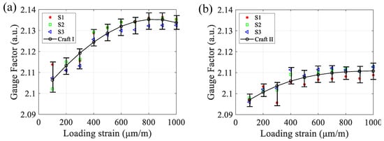 The GF was measured from two groups of fabricated strain gauges. Three samples with smoother sidewall profiles manufactured by Craft I (a), while the other three fabricated by Craft II have rougher sidewall profiles (b). The loading strain increases from 100 to 1000 μm/m.