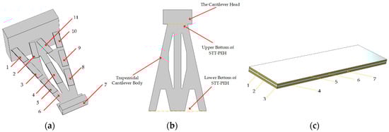 The structure of the STTM-PEH, T-shaped trapezoidal cantilever beam and piezoelectric patch. (a) 1,2,3,5,8,9,10,11—piezoelectric patches (piezoelectric layer: PZT-5H); 4—long piezoelectric patch (piezoelectric layer: PZT-5H); 6—T-shaped trapezoidal cantilever beam (copper); 7—mass (structural steel). (b) Structure of T-shaped trapezoidal cantilever beam. (c) 1,3—electrode; 2—piezoelectric material; 4,5—insulation layer; 6,7—conductive adhesive layer.