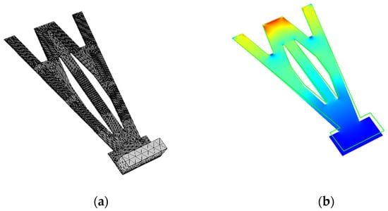 We use the finite element method (FEM, software COMSOL Multiphysics 5.5) to analyze the output performance of the STTM-PEH and the physical modules, selecting piezoelectric, circuit, solid mechanics and static electrostatic. Meanwhile, we use four-node free tetrahedron elements to generate meshes. To improve the computational efficiency, only the piezoelectric layer is retained in the simulation, while the conductive adhesive layer, electrode and packaging layer are ignored. Additionally, different refined meshes are applied to the cantilever beam, piezoelectric patches and mass to improve the calculation accuracy. The meshes of the STTM-PEH and stress distribution of the T-shaped trapezoidal piezoelectric cantilever beam are exhibited in Figure 2.