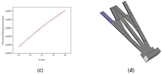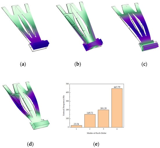 When the natural frequency of the piezoelectric energy harvester is consistent with the external vibration frequency, the energy collected by it reaches the maximum. Therefore, studying the modes of the STTM-PEH is beneficial for structural design and obtaining more outstanding output performance. Figure 3 shows various modes of the STTM-PEH. Figure 3a,b show the first-order and second-order modes of the harvester, while Figure 3c,d show the third-order and fourth-order modes, respectively. The natural frequencies of each mode are, respectively 23.54 , 149.72 , 201.29 and 447.79 , as show in Figure 3e.