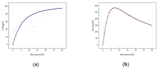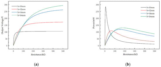 Figure 13 shows the voltage–resistance curves and the power–resistance curves for different cantilever head lengths. The results show that the shorter the cantilever head of the STTM-PEH, the faster the output voltage–resistance curve rises (Figure 13a). In addition, it can also be seen that the longer the length of the cantilever head, the slower the power–resistance curve falls in its descent zone (Figure 13b). Therefore, a STTM-PEH with a shorter cantilever head length is more suitable in a situation where a low external loading resistance is required, while a STTM-PEH with a longer cantilever head length should be selected when the external loading resistance exceeds 200 .