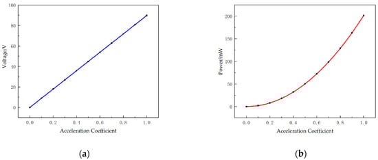 On the other hand, the output performance of STTM-PEH is affected by external vibration excitation. Figure 5 shows the output voltage and output power of the STTM-PEH in the range of acceleration coefficients from 0 to 1.0 under the condition that the external loading resistance is 20 . Figure 5 indicates that the output voltage and power of the STTM-PEH increase as the acceleration coefficient rises. The output voltage of the STTM-PEH is proportional to the acceleration coefficient, while the growth rate of its output power–acceleration coefficient curve gradually increases. However, it should be noted that it is impossible to increase the acceleration coefficient indefinitely in practical applications.