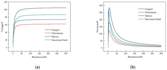 Output performance–resistance curves of the STTM-PEH under different substrate materials. (a) Output voltage–resistance curves. (b) Output power–resistance coefficient curves.