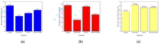 (a) Maximum output voltage of the STTM-PEH under different substrate materials. (b) Maximum output power of the STTM-PEH under different substrate materials. (c) First-order natural frequencies of the STTM-PEH under different substrate materials.