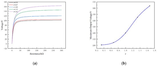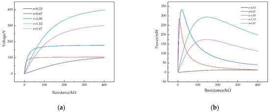 The relationship between the resistance and output voltage of the STTM-PEH with different piezoelectric patch thicknesses is reflected in Figure 8 when the thickness of the substrate is constant. The result illustrates that when the resistance is greater than 50 the output voltage of the STTM-PEH tends to be stable and that its maximum output voltage increases with a rise in . When the thickness of the piezoelectric patches is 0.5 (r is 1.67), the maximum output voltage is about 163.7 .