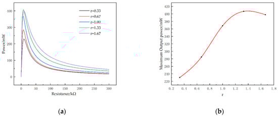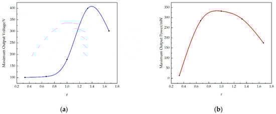 Figure 9a shows that the output power–resistance curve falls more slowly with an increase in . This means that the STTM-PEH with thicker piezoelectric patches can generate higher output power in the descent zone of its output power–resistance curve with identical external resistance. Hence, thicker piezoelectric patches should be selected for higher output power when the external resistance is greater than 50 . Moreover, in contrast to the variation in the maximum output voltage, the maximum output power increases first and then decreases with a rise in the piezoelectric patch thickness. When the thickness of piezoelectric patch is 0.4 (r is 1.33), the maximum output power of STTM-PEH is about 406.8 and its optimal resistance is about 8 , as shown in Figure 9b.