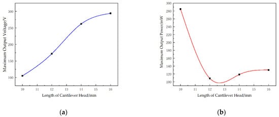 It can be seen from Figure 12a that expanding the length of cantilever head can increase the maximum output voltage of the STTM-PEH. The maximum output voltage of 294.2 is obtained with a STTM-PEH with a cantilever head length of 16 mm. However, unlike the maximum output voltage, the maximum output power decreases first and then increases with a rise in the cantilever head length, as shown in Figure 12b, which indicates that the optimal output performance cannot be obtained by simply increasing the length of the cantilever head.
