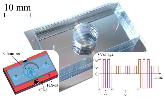 The actuator is shown in Figure 1. The chip has lateral sizes of 35 × 20 mm and its height is 4 mm. The working chamber, with a diameter of 500 μ m, is located in the center of the chip and contains two electrodes deposited on the oxidized silicon wafer. The bilayer electrodes are made of aluminum (bottom, conducting) and titanium (top, working) layers with a thickness of 0.5 μ m each. The electrodes have a concentric shape that provides the largest deflection of the membrane compared to other designs []. The side walls of the chamber are made of a SU-8 photoresist with a thickness of 16 μ m. The chamber is sealed with a 30 μ m thick PDMS membrane and is filled with the electrolyte through 100 μ m wide channels formed in the SU-8 layer. A molar solution of Na 2 SO 4 in distilled water is used as the electrolyte.