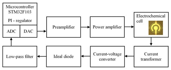 In this work, we implemented a special technique to keep the performance stable. The adjustment of U p is carried out by a homemade pulse generator equipped with an automatic system of current tracking and keeping the current at a given level. The scheme of the generator is shown in Figure 2. The main unit is a microcontroller STM32F103. It supplies a series of pulses with the duration t a and sends it to a preamplifier via a digital-to-analog converter. The preamplifier shifts the DC component of the signal to create the AP pulses. These pulses are fed to a power amplifier with a voltage gain of 20. The amplifier provides a maximum output current of 1 A and an output voltage swing up to ± 22 V. The amplified signal is applied to the electrochemical cell. The current flowing through the cell is reduced by 100 times by the current transformer and fed to the current–voltage converter based on an operational amplifier. The voltage that follows the shape of the current is applied to an ideal diode circuit, which converts the negative values to positive ones. Then, the signal is averaged by a low-pass filter based on the RC circuit. Thus, the voltage proportional to the average current I a , i during the i-th series of AP pulses is prepared and transferred to the analog-to-digital converter. The microcontroller compares I a , i with the target current I 0 , which is preset by the user, and calculates an increment to the amplitude of the SP pulses using a proportional integral (PI) controller: