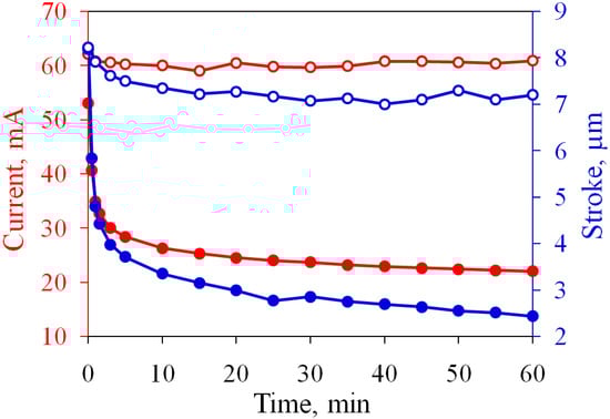 The experiment demonstrates that the performance of the oxidized electrodes can be restored to the initial level. To investigate the long-term operation of the actuator, we drive it in the current stabilization regime during one hour. The target value is increased to I 0 = 60 mA in order to enhance the stroke. The time dependence of I a and d is shown in Figure 3 by open circles, where it can be compared with the normal driving regime. The current is kept well at a given level and varies from 59 to 62 mA, and the stroke is stabilized at d = 7.2 μ m.