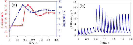 Figure 4. Operation of the actuator in the current stabilization regime during the first 18 cycles: (a) the average current and amplitude of the SP pulses; (b) the deflection of the membrane. The PI coefficient is K = 1.5 × 10 8 .