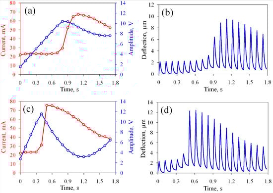 Next, the same device is tested in the current stabilization regime. The target current is set to be I 0 = 55 mA and slightly exceeds the initial value for the non-oxidized electrodes. The polarity of the SP pulses is positive and the PI coefficient is K = 1.5 × 10 8 . The current I a reaches the target value I 0 in several working cycles, as shown in Figure 4a. During the first AP series, the actuator conducts I a = 22.3 mA, which is close to the value observed at the end of the previous test. Since I a is significantly smaller than I 0 , the generator immediately sets a non-zero amplitude U p = 2.1 V. This value does not provide the necessary increase in the current and U p increases further over the next five cycles with a step of Δ U p 1.7 V and reaches 11.8 V. At the seventh series ( t = 0.6 s), the current rises sharply to 66.7 mA. This value exceeds the target level, so U p obtains a negative increment. After a few oscillations, the current gradually (in approximately 2 s) approaches I 0 . The amplitude of the SP pulses also approaches a balance value of 9 V.