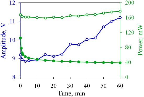 The change in the amplitude of the SP pulses with time is shown in Figure 6. In the first few minutes, U p decreases from 9.2 to 8.8 V, but then it demonstrates an upward trend. By the end of the test, the amplitude reaches 11.2 V. The power consumption of the actuator is also shown in Figure 6. The sample with the non-oxidized electrodes consumes P = 105 mW. In an hour of operation in the normal regime, P is reduced to 38 mW due to the decrease in I a . In the current stabilization regime, the power consumption increases, since the additional current flows through the electrodes during the passive time. At the beginning of the test, the actuator consumes P = 168 mW, which is 60% higher than that for the “fresh” sample. The power increases to 177 mW in 60 min, which can be considered a relatively small increase.