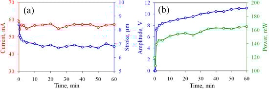 Figure 7. The actuator with non-oxidized electrodes in the current stabilization regime: (a) time dependence of the current and stroke; (b) the same for the amplitude of the SP pulses and consumed power.