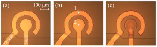 The chemical composition of the electrodes is investigated for the samples containing the electrodes without a chamber. The electrodes before the test are shown in Figure 8a. The contact lines are protected from the electrolyte by the SU-8 layer. First, the sample operates in the normal regime for an hour. The signal is applied to the inner electrode, while the outer one is grounded. At the beginning of the test, the sample conducts I a = 60 mA, but after 60 min, I a drops to 20 mA. In general, the current demonstrates the same behavior as observed for the actuator. The electrodes become darker in comparison with the original image, as one can see in panel (b). The darkening indicates the formation of the oxide layer on the surface of the electrodes []. The oxidation is confirmed by the EDX analysis data presented in Table 1. Oxygen is not detected at the “fresh” electrodes, but in 60 min, its content increases to 16.3 and 14.2% for the inner and outer structures, respectively. Both electrodes are oxidized because each of them alternately serves as a cathode and anode. The inner electrode exhibits a slightly higher amount of oxygen, since it has a smaller area and, therefore, a higher current density. The presence of aluminum and silicon in the signal is explained by the radiation coming from the conductive Al layer and from the Si substrate. The low amount of carbon is due to contaminations and residues of the photoresist.