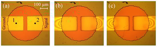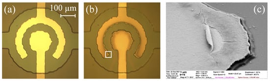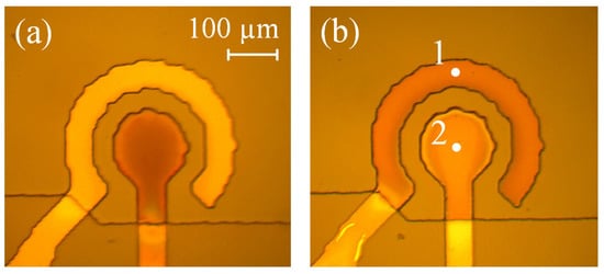 The current stabilization regime ensures the long-term operation of the actuator, with a large stroke corresponding to the intensive production of nanobubbles inside the working chamber. The nanobubbles containing a mixture of H 2 and O 2 gases combust near the electrode and provide strong mechanical action on the surface. This phenomenon leads to erosion of the material, as was recently demonstrated for platinum []. To observe the damage to the Al/Ti electrodes, we used actuators without a reflective Al layer at the membrane (the layer is used to observe the membrane movement interferometrically). The sample worked for 60 min at I a = 55–59 mA. The chamber before and after the test is shown in Figure 12a,b. The electrodes turned brown due to the oxidation. Their edges darkened especially strongly, since the current density in these regions was the highest.