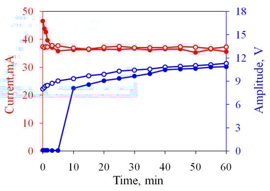 Next, we use a “fresh” sample in the current stabilization regime with the positive SP pulses and then change the polarity to negative. In both cases, the current is kept at 36–37 mA for 60 min. In contrast to the concentric electrodes, both tests are performed with the same sample. The current and amplitude of the SP pulses are demonstrated in Figure 11. For the positive polarity, the SP pulses are switched on at the 10th minute. Their amplitude increases from 8.1 to 10.9 V during the test. As one can see in Figure 10b, the electrodes darken in comparison with the original image in Figure 10a. The right electrode darkens more strongly, which is especially noticeable at the edges. This reflects the oxygen content of 13.5%; see Table 3. The left electrode contains 7.7% of oxygen, which is only 1.1% lower than the amount of O after the normal operation. One can conclude that the current stabilizing regime provides stronger oxidation compared to the normal regime, which confirms the conclusions drawn for the concentric electrodes.