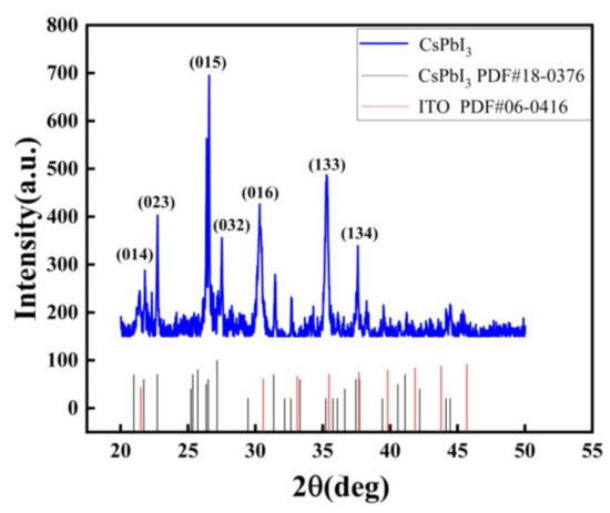 Peaks from the δ-phase can be seen from the X-ray diffraction (XRD) pattern [21]. As shown in Figure 1, the crystal phases of diffraction peaks at 21.8 degrees, 22.7 degrees, 26.6 degrees, 27.5 degrees, 30.3 degrees, and 37.6 degrees are (014), (023), (015), (032), (016), and (134), respectively. However, the PDF card (No. 18-0376) of the CsPbI3 with yellow phase had diffraction peaks at 35.2 degrees, (133), perhaps indicating CsPbI3 tends to change to yellow phase in the air.