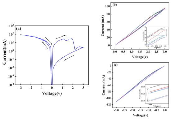 (a) The memory switching measurement of the Au/CsPbI3/ITO artificial synapse. The memory behavior of the Au/CsPbI3/ITO artificial synapse is measured by (b) five positive scanning voltage and (c) five negative scanning voltage.