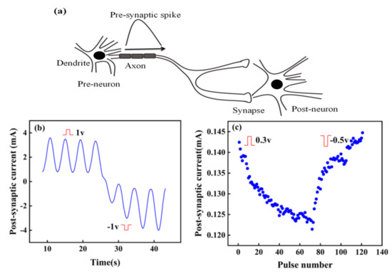 In biology, synapses can be excitatory or inhibitory, specifically manifested as the increase or decrease of post-synaptic current (PSC). Figure 5a shows the signal transmission between two neurons. When the pre-spike arrives at the post-neuron, the state of post-neuron will change and be in a state of excitation or inhibition. Excitation and inhibition in a synapse depend on the change of the probability of action potential in post-synaptic cells, with the increase of action potential of pre-synaptic neurons [30]. Similarly, the conductance of the artificial synapse, a quantitative representation of the synaptic weight, can increase or decrease with the input voltage pulses.