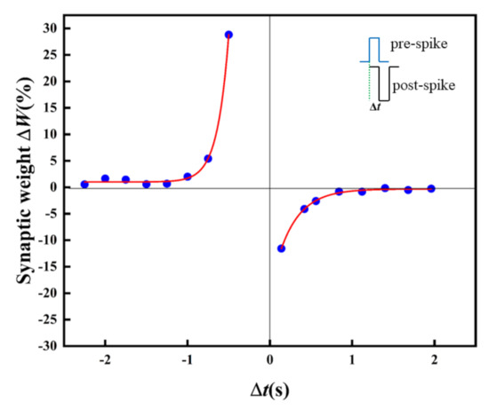 In biology, the STDP learning rule is a typical LTSP. As one of the basic learning rules for simulating synaptic functions, the synaptic weight can be enhanced/inhibited by adjusting the spike time or sequence through STDP [36]. For the sake of the STDP function realization, pulses with an amplitude of 0.3 V and −0.5V are imposed on the artificial synapse as the pre-synaptic spikes and post-synaptic spikes. Figure 9 displays the STDP in the artificial synapse. The relative change of synaptic weight (ΔW) changes with the change of relative time (Δt). The artificial synapse is in the LTP state is at Δt < 0. However, the artificial synapse turns to LTD at Δt > 0.