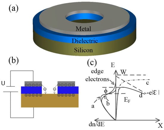 The proposed temperature-sensing element is a vertically aligned MIS diode with a void channel in the center, as illustrated in Figure 1a. The cathode material is aluminum. Silicon substrate (boron-doped, resistivity = 10 Ωcm, (100)-oriented) acts as anode. The dielectric layer material is silicon nitride (Si3N4), and the thickness is 80 nm (comparable to the mean free path of electrons in air). The radius of the vacuum channel is set as 30 μm. Electrons accumulate at the cathode–dielectric interface forming the so-called quasi-two-dimensional electron system (2DES) (width <1 nm) [24,27] in the cathode side under negative voltage bias, as shown in Figure 1b. In the 2DES, electrons can travel freely in the lateral dimension but can hardly move in the vertical dimension. Electrons near the cleaved edge of the void channel suffer asymmetrical Coulombic repulsion from surrounding electrons and are readily injected into the vacuum channel. Thus, the surface vacuum barrier height of the 2DES is much lower than the work function of Al (4.28 eV). Moreover, the height of surface barrier will further decrease under external electric field bias, as depicted in Figure 1c. When the voltage bias was relatively low (<1 V), emission current I of this device was subjected to space-charge limitation (SCL) regime, where the current exhibited a 3/2 power dependency of voltage and was irrelevant to temperature, as demonstrated in our former work [28]. As the voltage bias increased, the electron emission mechanism then turned into the barrier-lowering effect regime (field-assisted thermionic emission), where lg I showed a linear relationship with U1/2/T, U refers to bias voltage and T refers to temperature, as shown in Figure 2c and Equation (1) which will be discussed later. The experimental fabrication details and verification of the electron emission mechanism can be seen in the Supplementary Materials in our former work [26,28].