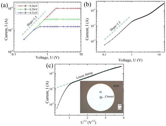 I−U curve of the proposed vacuum diode under room temperature. (a) Simulated results of I−U characteristics with different equivalent work functions. (b) Measured I−U characteristics in a lg−lg plot. (c) Measured I−U characteristics in a lg I−U1/2 plot. The inset is a picture of the diode taken by metallographic microscope. The linear relationship indicated the barrier−lowering effect mechanism.