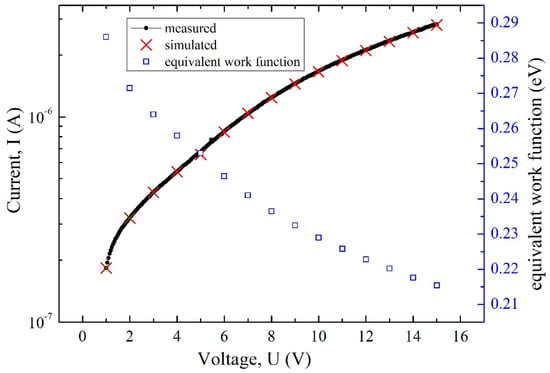 As for the barrier-lowering effect regime, the surface barrier of the cathode decreased as the voltage bias increased, as mentioned above. The work function in the Richardson–Dushman equation could be treated as equivalently decreased during the calculation of the emission current. Hence, the equivalent work function corresponding to the applied voltage bias could be calculated from the measured data, considering that the practical electron emission surface was not ideal as the simulating model. Additionally, the actual emission surface might be speckled, and the area would be smaller than the calculated value of the model. The effective electron emission area was then calibrated with a coefficient of 1.74 according to the measured data. The equivalent work function could be uniquely determined when the simulated results fitted the experimental results measured at room temperature, as depicted in Figure 3. If a constant current source was applied to the diode, then temperature was a function of Φ according to the Richardson–Dushman equation. In other words, the voltage bias was related to temperature. Therefore, this diode could be used as a temperature sensor.