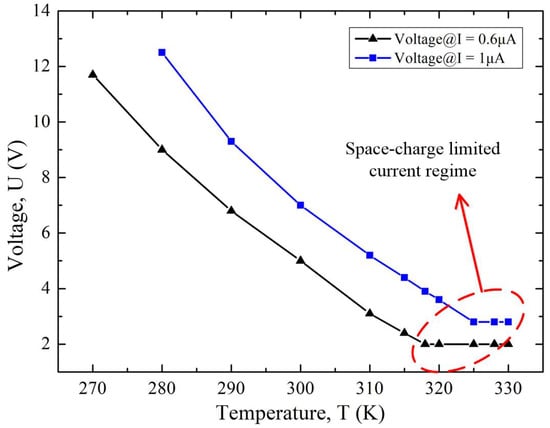 Figure 4 showed the simulated temperature response characteristics of the diode under two different constant current values. In the barrier-lowering effect regime, voltage was negatively related to temperature. Meanwhile, voltage was irrelevant to temperature if the diode was operated in the space-charge limited current regime, in which the electric field was too weak to attract the emitted electrons to the anode in time, forming the so-called virtual cathode in the vacuum channel. Hereby, the current was governed by voltage rather than temperature. In order to ensure that this diode was working in the barrier-lowering effect regime, the upper limit of the temperature-sensing range was confined, as shown in Figure 4. Considering the power consumption issue, the lower limit of the temperature-sensing range was also confined. The effective sensing range could be modified by the constant current source, as depicted in Figure 4. According to Figure 4, the temperature-sensing sensitivity of a single diode could be estimated to be 200 mV/K.