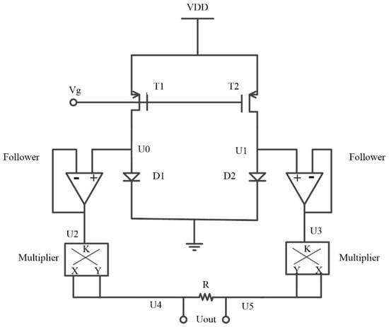 However, according to Figure 4 an Equation (1), the relationship between the voltage and temperature of the diode is nonlinear. To achieve a linear dependency of voltage on temperature, a PTAT circuitry was proposed, as shown in Figure 5. Transistors T1 and T2 form a current mirror, supplying exactly same current to vacuum diodes D1 and D2. The emission area of D1 and D2 met the relationship of D1 = ρD2 (ρ > 1). The stack layer materials and vacuum channel length of the two diodes are exactly the same. The current emission of the diodes satisfies the following equations: