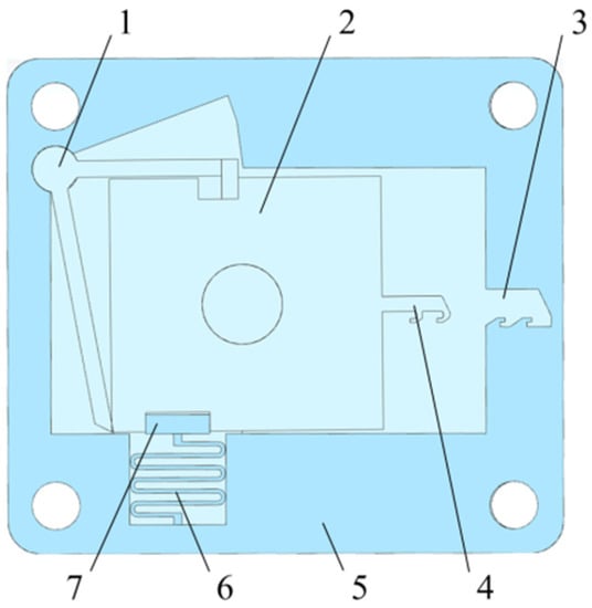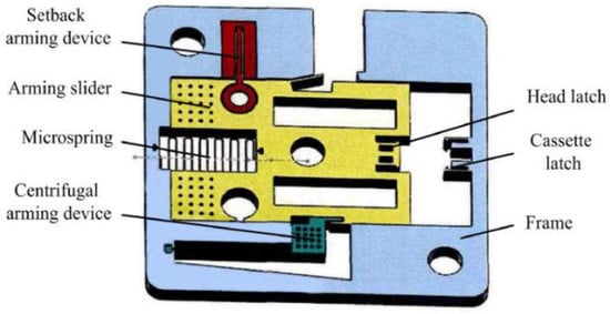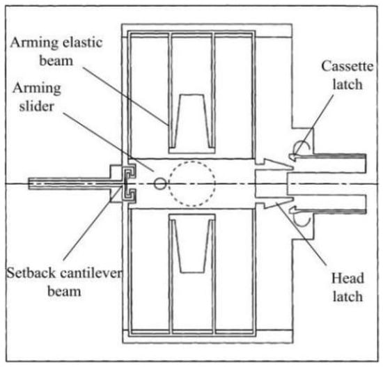 In recent years, with the development of intelligent ammunition technology, modern fuzes have been endowed with more functions, such as flight control, explosion point control, trajectory correction, target recognition, and positioning, in addition to state control and initiation control. However, the volume limitations of traditional fuzes restrict the expansion of these functions, and this fuze-development problem has been effectively solved by the emergence of MEMS fuzes [1,2,3,4,5]. A setback arming device is the core device in a MEMS fuze and is used to ensure service process safety and launch reliability [6,7,8,9,10]. Most setback arming devices are oriented parallel to the projectile axis when installed, meaning that the explosive train is not in the same straight line [11,12,13]. Therefore, the direction of detonation energy transmission needs to be changed, resulting in energy loss. In serious cases, the detonator may not be able to detonate the warhead charge, resulting in a “dud” phenomenon [14,15]. To create MEMS fuzes with higher performance and more space to achieve additional functions, research on MEMS setback arming devices that are placed perpendicular to the projectile axis (hereinafter referred to as “vertical-frame-based setback arming devices”) has gradually become popular in recent years [16,17,18,19,20]. Figure 1 shows a vertical-frame-based setback arming device that was proposed by Koehler et al. [21], which consists of a setback cantilever beam, an arming elastic beam, an arming slider, a head latch, and a cassette latch. Generally, the arming slider is locked in the safe position by the setback cantilever beam and the arming elastic beam. When a projectile is launched, the setback cantilever beam moves downward under the action of the setback force and breaks away from the arming slider, thus removing the restriction on the arming slider.