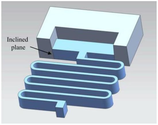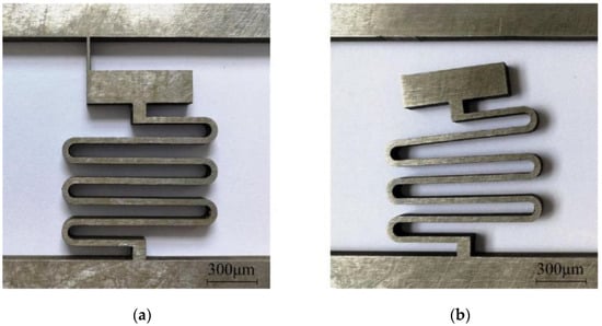 Due to the small size of the inclined planes on both sides of the setback slider, if two inclined planes are processed at the same time, the requirements for preparing the formed electrode are higher. Therefore, the method for separately processing each single inclined plane is adopted in this paper. The surface to be processed is fixed at an incline during processing, and the bottom and side of the electrode wire were used for processing. The frame with an auxiliary support beam was then heated to 600 °C in a two-chamber vacuum permeable furnace for destress annealing treatment. After two hours, the device was placed in air to naturally cool [32]. After this step, the residual stress of the microspring was smaller, and there was no secondary deformation due to the high temperature during processing. Finally, the auxiliary support beam was removed using the EDM process.