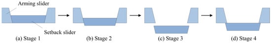 Figure 4 shows a MEMS safety and arming (S&A) device applied to a certain type of 105 mm grenade, and its size is 12 mm × 10 mm × 0.8 mm. When the device is installed, it is oriented perpendicular to the axis of the projectile, and it mainly includes a setback arming device and arming device. The setback arming device is composed of a setback slider, a microspring, and a frame, and the arming device is composed of a driving wheel, a pin pusher, an arming slider, a head latch, and a cassette latch. The setback arming device is mainly studied in this paper. The application background of the requirements is as follows: the peak value of the most dangerous drop overload in the service processing stage is 18,000 g, the duration is 0.1 ms, the peak value of the launch overload is 12,000 g, and the duration is 9 ms. This kind of setback arming device has the advantage of a simple structure and can be used to replace the setback slider and the zigzag slot in the traditional device with a pair of inclined setback sliders and arming sliders. In the initial state, the setback slider and the arming slider are tightly assembled together and connected to the frame with microsprings. The ANSYS/LS-DYNA finite element software simulation shows that when the slope angle of the setback slider and the arming slider is set to 87°, the service processing and launch stages can be distinguished by controlling the movement time of the setback slider, as shown in Figure 5. The service processing action time is very short, and the inertial force induced on the setback slider is not high enough to overcome the friction between the inclined surfaces. When the inertial force disappears, the setback slider returns to its original position under the action of the microspring restoring force. The launch action time is relatively long. The setback slider moves away from the arming slider under the action of a continuous setback force. In the process of movement, the setback slider is squeezed by the arming slider, undergoes a deflection deformation, and returns to its original shape after passing through the inclined plane. At this time, the setback slider cannot return to the initial position due to the obstruction of the arming slider, and the process of safety release is shown in Figure 6.
