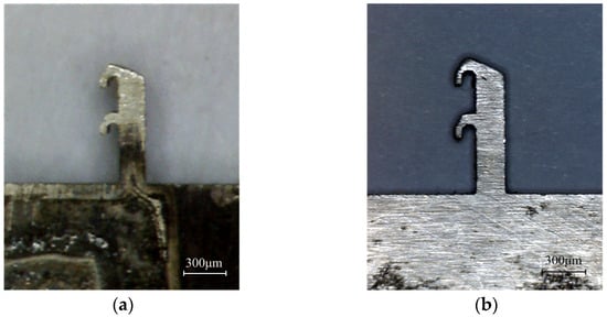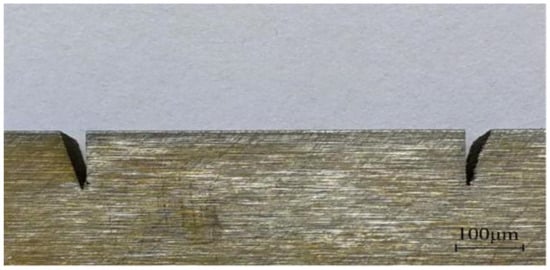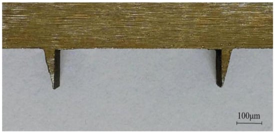 The processing accuracy of the electrode directly affects the processing accuracy of the V-shaped groove. To reduce the influence of electrode loss on the processing accuracy, the V-shaped groove forming electrode was fabricated through the WEDM process. A CA30 immersion precision CNC low-speed wire cutting machine tool was used for processing. The electrode material was a copper-tungsten alloy. The copper-tungsten alloy electrode has the characteristics of high-temperature resistance, arc ablation resistance, high electrical conductivity, and high thermal conductivity. The electrode loss during processing was extremely low, which was conducive to improving the quality of the processed surface. The electrode wire was a brass wire with a diameter of 0.2 mm, the dielectric was deionized water, and the resistivity was 1 × 105 Ω·cm. During electrode processing, the machining tool uses a lower feed speed and keeps the speed constant for multiple cuttings. The main parameters are shown in Table 5. Figure 21 shows an actual picture of the processed electrode; the picture shows that the electrode has a good processing quality and high shape accuracy. The processed electrodes were measured via stereoscopic microscopy. The measured results are shown in Table 6. The distance l′, height h′, and angle α between the left and right electrodes are similar to the design values, meeting the processing requirements.