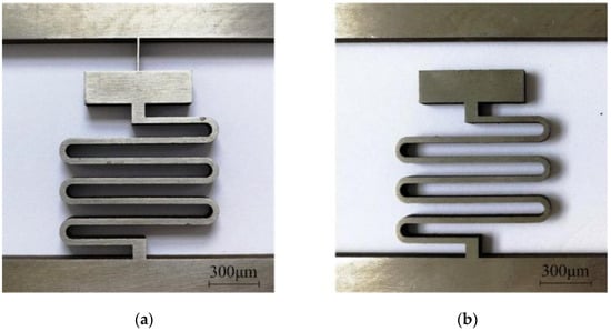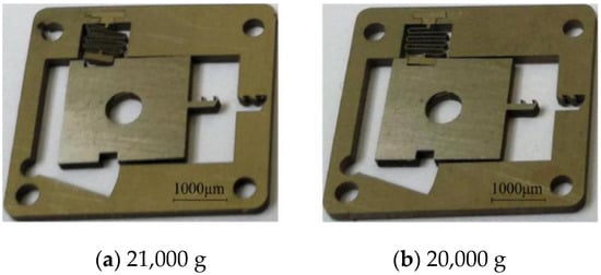 Microspring machining is technically difficult in the fabrication of setback arming devices by EDM; this is the main reason why the EDM process cannot be used in setback arming device manufacturing. Due to the size effect and residual stress, microsprings are prone to flexural deformation and secondary deformation in the machining process. In this paper, a high-purity hard nickel plate is selected as the processing material, and the processing machine is a CA30 immersion precision CNC low-speed wire cutting machine produced by Agie Charmilles Company (Biel, Switzerland). The processing scheme that involves orienting the auxiliary support beam in the longitudinal direction of the microspring is adopted, as shown in Figure 8a. After a trial cutting of the microspring, it is found that when the width of the support beam is set to 0.06 mm, the processed microspring undergoes a large deflection deformation and deviates to one side of the support beam, as shown in Figure 8b. On one hand, this phenomenon may be due to the long EDM discharge time that is required when the support beam with this width is removed, leading to a longer time during which the flushing pressure and discharge reaction force act on the microspring and excessive residual stress after machining. On the other hand, this phenomenon may be related to the position of the support beam. The support beam is located on one side of the microspring end, providing an uneven support force that results in a stress concentration when the support beam is removed.